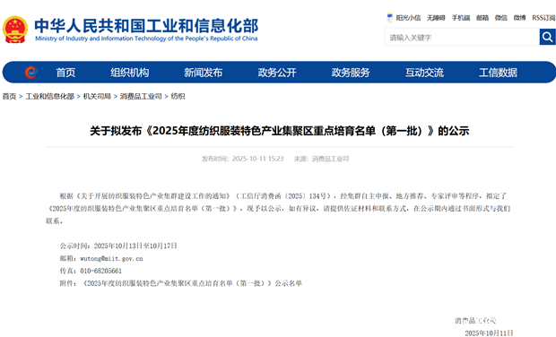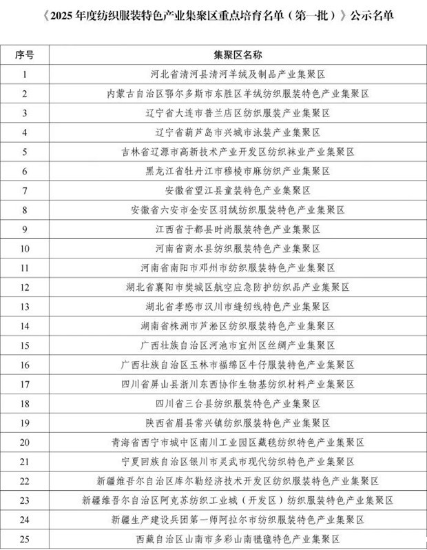 工信部发布《2025年度纺织服装特色产业集聚区重点培育名单(第一批)》公示名单